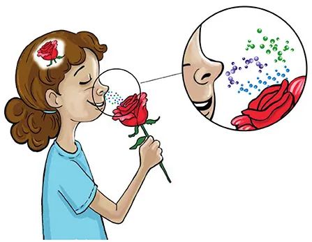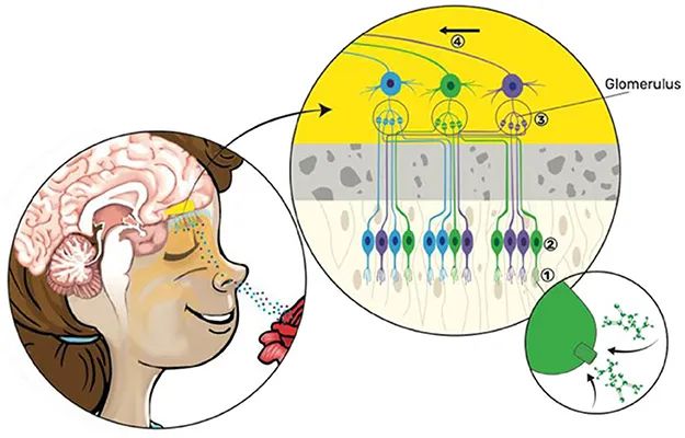 我们是怎么闻到气味的?发表时间:2025-06-04 10:45 我们周围的世界充满着气味(味道),有些令人愉悦、平静或令人回忆往事,而另一些则充满刺激性、让人害怕或恶心。那么,你能分辨出多少种气味呢?也许你会惊讶地发现,人类可以识别成千上万种不同的气味——这可不是一项容易的任务。那么,我们是如何做到的呢? 在本文中,我们将通过嗅觉系统闻到“出路”,探讨鼻子与大脑之间的联系,看看大脑是如何处理气味、唤起独特的反应。 SAIXIANSHENG 我们是怎样闻到气味的? 当你看到一束漂亮的花或经过香水店时,你通常会靠近闻一闻。你是否曾经想过所闻到的到底是什么?你是如何识别这种气味? 你可知道,当你闻花的时候,你会吸入花释放出来的分子,通过大脑中发生的电活动来建立花朵气味的内部表征(图1)。