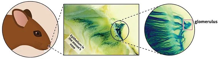 图2 鼻子中的嗅觉受体。在鼻子内上后部的鼻上皮,有一种叫做嗅觉感受神经元(OSNs)的细胞,它们具有被称为气味受体的蛋白质分子。嗅觉感受神经元上的受体与漂在空气中的分子相互作用,而气味分子与嗅觉感受神经元的相互作用会产生电信号,并通过神经纤维(轴突)传递大脑中的嗅球区域。从那里,电活动继续传递到大脑中处理嗅觉信息的其他区域(彩色圆圈)。 SAIXIANSHENG 鉴定气味受体基因 当我开始研究嗅觉系统时,已经知道动物能够分辨大量不同的气味,但不清楚是如何做到的。显然,这就意味着必须有一种大脑机制,使得动物能够识别广泛且多样的气味分子。这就引出了一个想法,即必定有大量编码气味受体蛋白的基因。此外,表达气味受体的嗅觉感受神经元也必须有一种将气味—受体相互作用转化为电信号的方法。 在我们的研究中,我们想要找到编码气味受体(或决定其性质)的基因。为此,我们做出了三个假设来简化研究工作: (1)存在编码气味受体的大基因家族; (2)存在将气味受体与气味分子的相互作用转化为电信号的机制; (3)编码气味受体的基因仅在鼻上皮的嗅觉感受神经元中表达。 基于以上假设,我们能够高效地在小鼠中寻找编码气味受体的基因家族。我们分离了小鼠的嗅觉感受神经元,并在其DNA中发现了一个由约1000个不同受体基因组成的新基因家族[2]。这是非常令人振奋的,因为这是第一次鉴定气味受体基因。23年之后,也就是2004年,这项发现使我和我的同事琳达·巴克(Linda Buck)教授获得了诺贝尔生理学或医学奖[3]。 鉴定得到气味受体基因后,我们可以使用复杂的技术(包括分子遗传学和神经成像)来探究与鼻腔和大脑中嗅觉感受神经元组织和活动相关的更为复杂的问题。例如,每个嗅觉感受神经元会表达多少个受体基因?每个嗅觉感受神经元只包含一种类型的气味受体还是包含多种类型的受体?这两种假设意味着嗅觉系统完全不同的结构和功能机制。事实证明,第一种假设是正确的:每个嗅觉感受神经元只表达约1000种可能受体基因中的一种。 SAIXIANSHENG 嗅觉感觉神经元的组织方式 现在让我们看看嗅觉感受神经元在鼻子和大脑中的组织方式,鼻子和大脑是气味识别发生的地方。对小鼠来说,鼻子里有1000万个嗅觉感受神经元和1000种不同的气味受体。由于每个嗅觉感受神经元只表达一种受体类型,这意味着每种受体类型会在10000个神经元中表达(10000000/1000 = 10000)。但是,在鼻上皮中,表达相同气味受体的10000个神经元是如何组织的呢?它们是分布在大的范围内,还是紧密聚集在一起?当它们与它们最喜欢的气味物质相互作用时,它们产生的电信号会发生什么变化?特定气味的信息是否会汇聚到大脑的特定区域? 为此,我们使用一种先进的技术,有选择地给表达相同受体基因的神经元着色,找到了这些问题的答案。在鼻上皮中,嗅觉感受神经元随机分布在一个大范围内(图3)。然后,嗅觉感受神经元将它们的延伸(被称为轴突的神经纤维)传递到大脑中处理嗅觉的第一个中继站,即嗅球。所有表达某种特定受体的10000个嗅觉感受神经元汇聚在嗅球的特定区域,被称为嗅小球(图3,右侧)。总的来说,嗅球中有1000个单独的嗅小球,每个嗅小球接收由所有表达某种特定受体基因的嗅觉感受神经元产生的信息[4]。